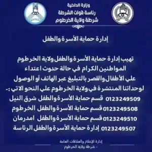 أفادت مصادر أمنية مطلعة بأن شرطة ولاية الخرطوم أطلقت رسميًا خطوطًا هاتفية مباشرة لتلقي البلاغات المتعلقة بأي انتهاكات أو تهديدات تمس سلامة الأطفال، في خطوة وُصفت بـ”الحاسمة” لتعزيز الحماية القانونية والاجتماعية للفئة الأكثر هشاشة في المجتمع.