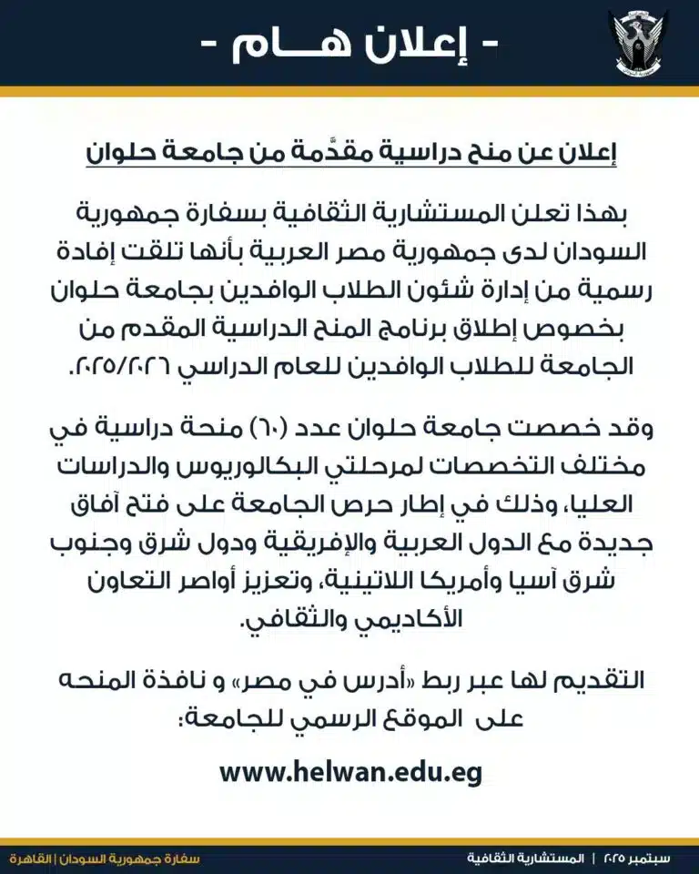 أفادت مصادر مطلعة داخل المستشارية الثقافية لسفارة السودان بالقاهرة، أن جامعة مصرية كبرى أطلقت برنامجًا استثنائيًا يتيح لعشرات الطلاب السودانيين استكمال دراستهم مجانًا ضمن منح أكاديمية مخصصة لعام 2025 – 2026.