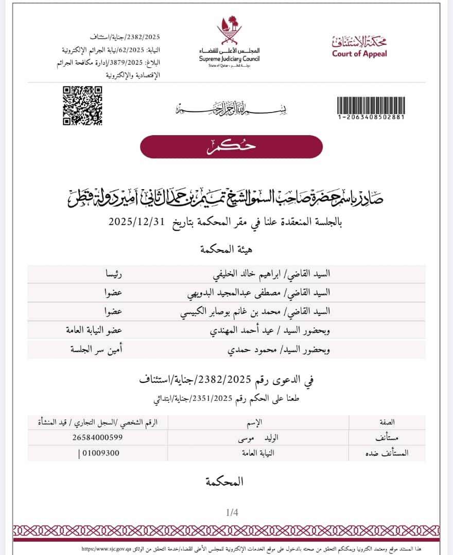 قضت محكمة الاستئناف القطرية، الأربعاء، بتأييد حكم إدانة ناشط سوداني في قضية أثارت اهتمامًا واسعًا، ما يجعل العقوبة نافذة ونهائية دون أي مسار قانوني لاحق، وفق ما أفادت مصادر مطلعة على مجريات الجلسة.