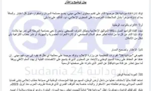 أكدت إدارة قناة “سودانية 24” التزامها بتقديم محتوى إعلامي مهني يضع مصلحة السودان واستقراره في مقدمة أولوياتها، مشددة على تمسكها بالشفافية والمسؤولية الوطنية في ظل الملاحظات التي وردت بشأن بعض المواد الإعلامية.